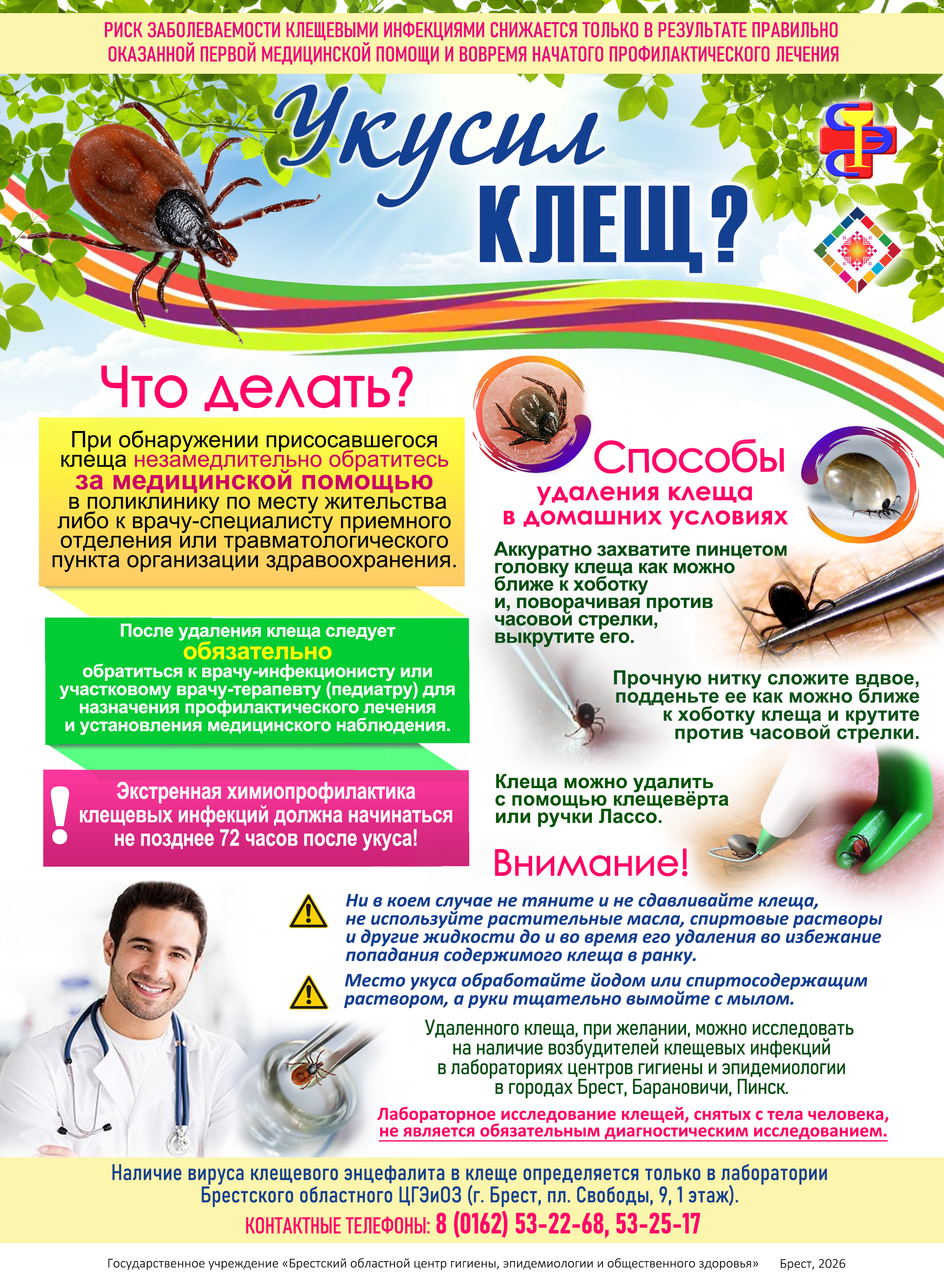 В Пружанском районе в 2026 году первые клещи в природе обнаружены в начале марта с численностью 13,12 экземпляров на флаго/км. Это означает, что нужно принимать меры предосторожности уже в первые теплые дни, не дожидаясь пика активности клещей. Клещи являются переносчиками возбудителей инфекционных заболеваний, как клещевой энцефалит, болезнь Лайма, гранулоцитарный анаплазмоз, моноцитарный эрлихиоз человека и др., которые причиняют вред здоровью человека. Клещи могут переносить одновременно несколько возбудителей клещевых инфекций, что вызывает широко распространенное микст-инфицирование человека после их присасывания. За истекший период 2026 года в учреждение здравоохранения за медицинской помощью по поводу укуса клещом обратилось 2 человека.